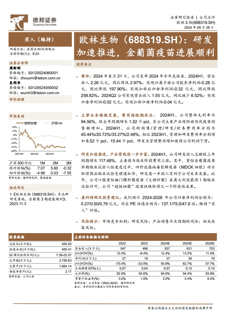 基于这些盈利预测,公司对应的PE估值分别为137.1倍(2024年)、75.0倍(2025年)和47.6倍(2026年)。尽管当前估值相对较高,但分析师认为,考虑到公司在疫苗研发领域的深厚积累、核心产品管线的顺利推进以及未来盈利的强劲增长潜力,其投资价值依然显著。因此,报告维持了对欧林生物的“买入”评级。