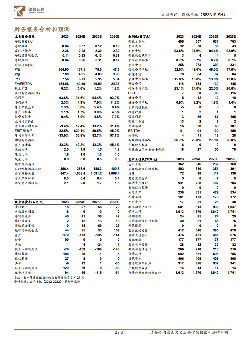从主要财务数据及预测来看,欧林生物的营业收入预计将从2023年的4.96亿元增长至2024年的5.57亿元,同比增长12.4%。此后,营收将继续保持稳健增长,预计2025年达到6.31亿元(同比增长13.2%),2026年增至7.03亿元(同比增长11.4%)。净利润方面,在2023年同比下降33.9%至0.18亿元后,预计2024年将实现55.8%的增长至0.27亿元,2025年和2026年将分别实现82.7%和57.7%的显著增长,达到0.50亿元和0.79亿元。