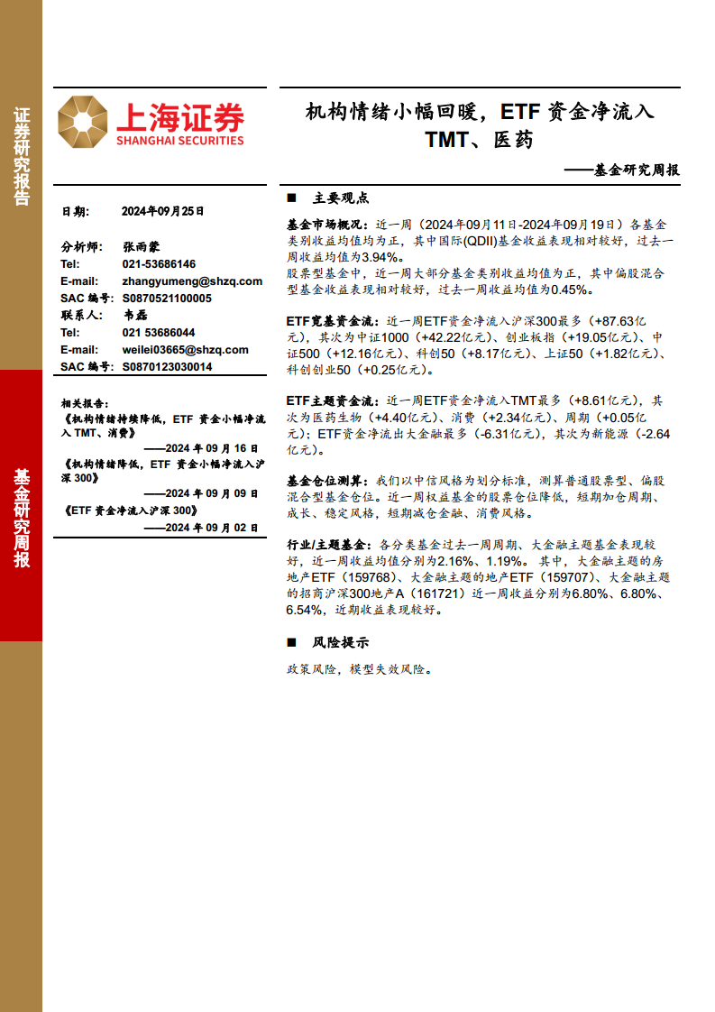 基金研究周报:机构情绪小幅回暖,ETF资金净流入TMT、医药