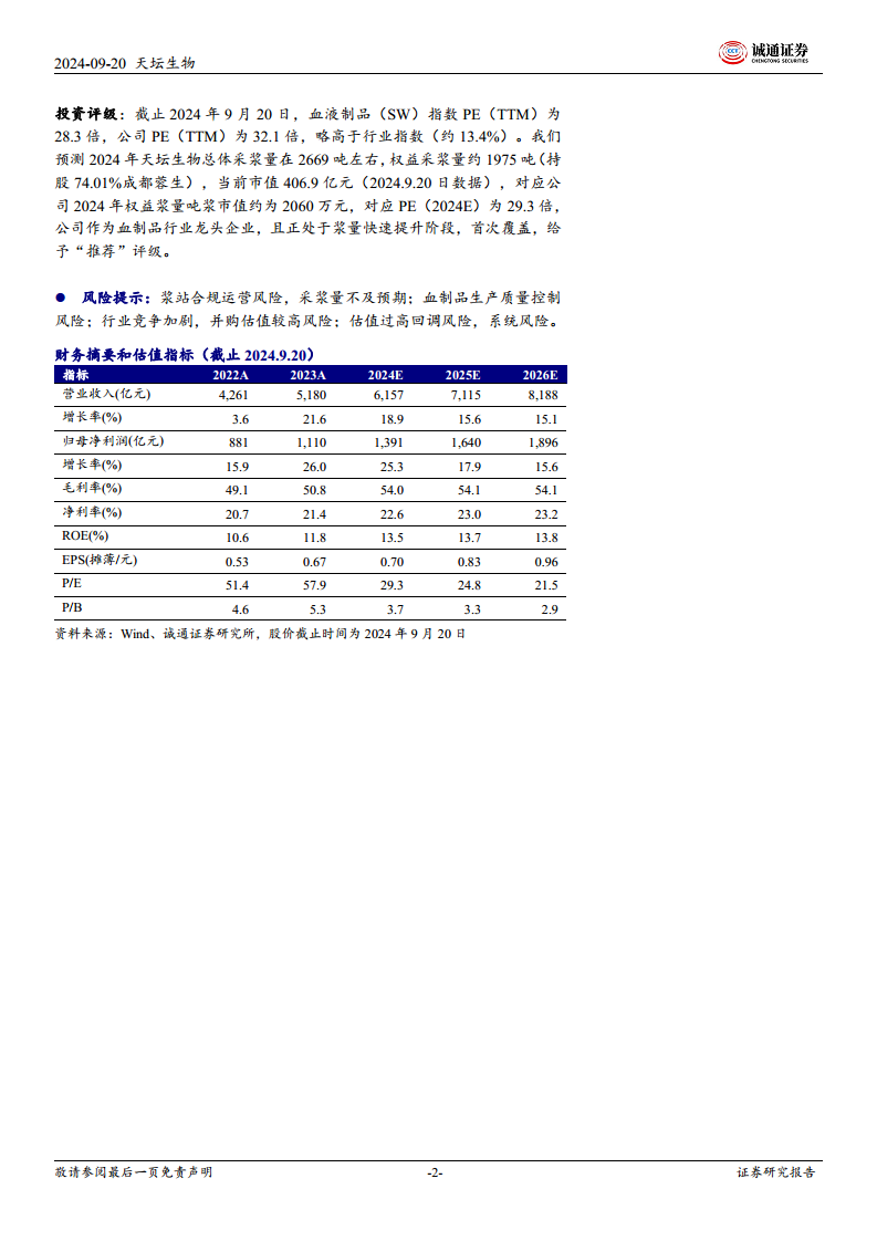 我们预测天坛生物2024-2026年营收分别为61.6亿元、71.1亿元和81.9亿元,同比分别增长18.9%、15.6%和15.1%;归母净利润分别为13.9亿元、16.4亿元和19.0亿元,同比分别增长25.3%、17.9%和15.6%。截至2024年9月20日,公司PE(TTM)为32.1倍,略高于血液制品(SW)指数的28.3倍。考虑到公司作为血制品行业龙头企业,且正处于浆量快速提升阶段,对应2024年权益浆量吨浆市值约为2060万元,对应PE(2024E)为29.3倍,首次覆盖给予“推荐”评级。