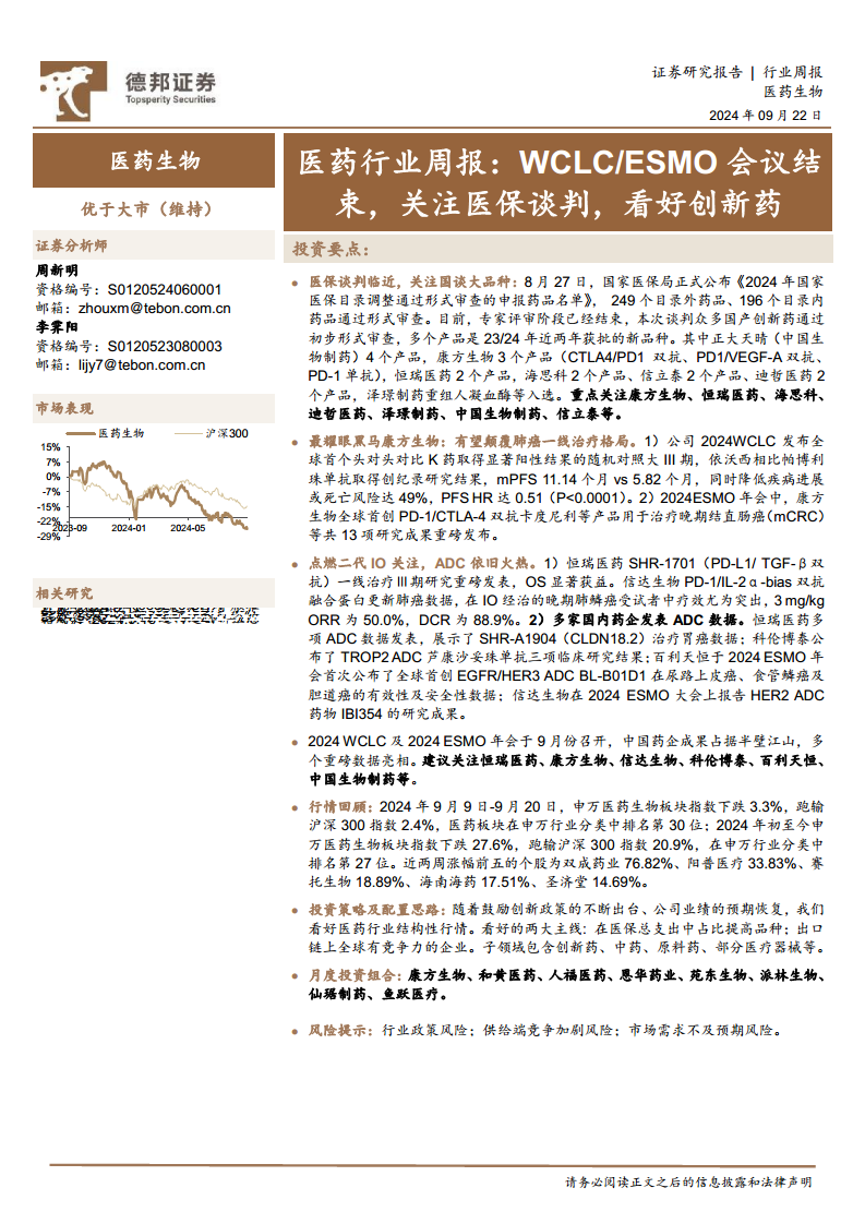 医药行业周报:WCLC ESMO会议结束,关注医保谈判,看好创新药