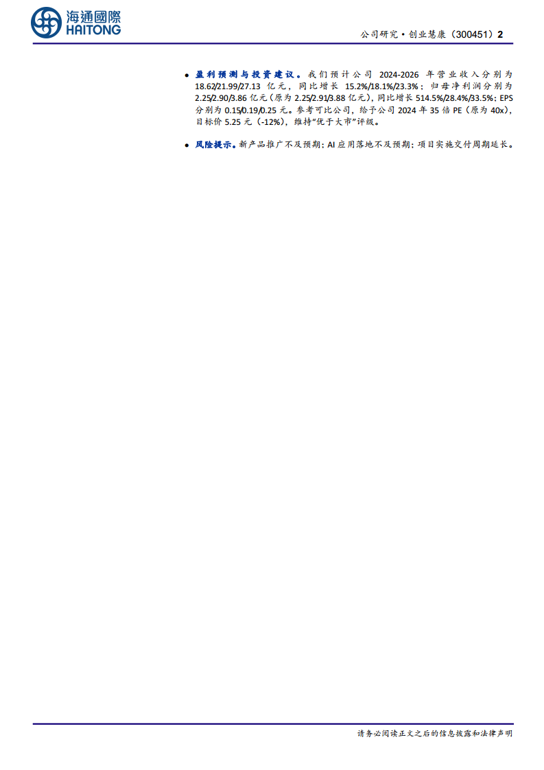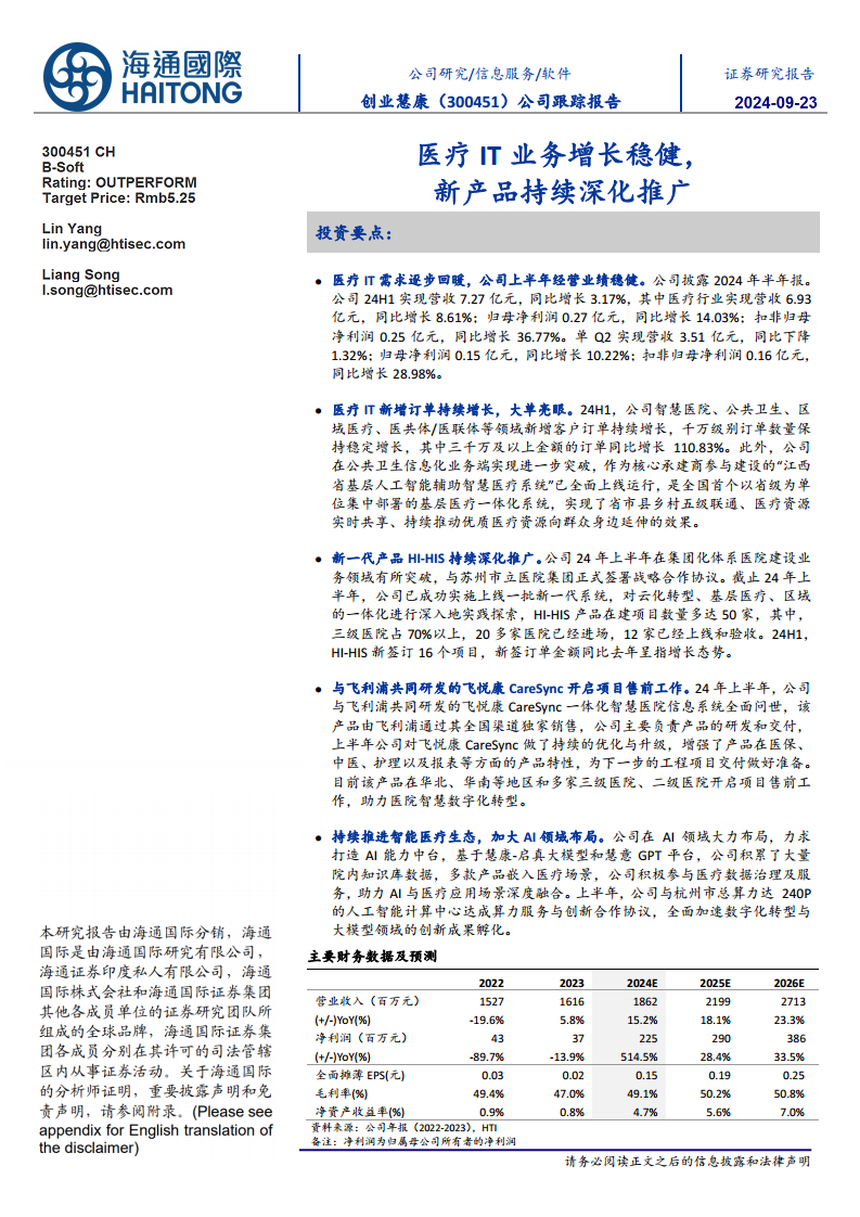 创业慧康在2024年上半年表现出强劲的增长势头,医疗IT市场需求回暖带动公司业绩稳健提升,尤其在新增订单方面表现突出,千万级以上大单数量显著增长。公司通过新一代HI-HIS产品的持续推广和与飞利浦合作的CareSync系统,不断深化市场渗透并拓展业务边界。同时,公司积极响应行业趋势,加大在人工智能领域的战略布局,致力于构建智能医疗生态,为未来发展注入新动能。尽管面临新产品推广、AI应用落地及项目交付周期等风险,但基于其稳健的经营表现和前瞻性的战略布局,分析师维持“优于大市”的投资评级,并对未来几年的营收和净利润增长持乐观预期。