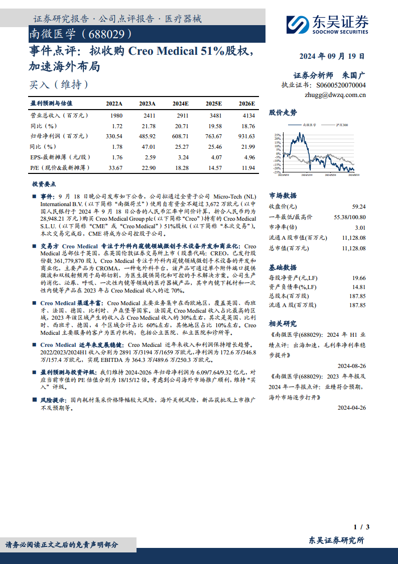 南微医学(688029):事件点评:拟收购CreoMedical51%股权,加速海外布局