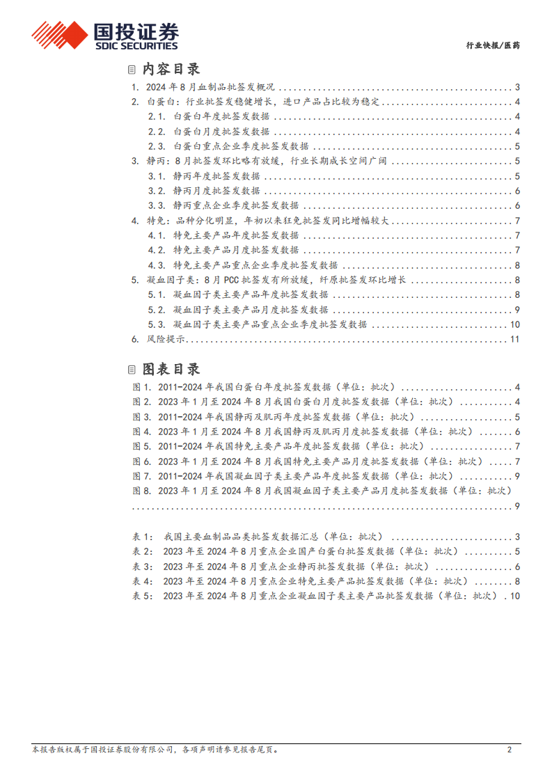 国投证券的医药行业快报深入分析了2024年1-8月中国血制品市场的批签发数据,揭示了各主要产品类别的市场动态和竞争格局。白蛋白市场保持稳健增长,国产与进口产品协同发展,头部企业市场份额稳定。静丙批签发量短期虽有波动,但长期成长潜力巨大,主要生产企业如天坛生物、上海莱士等占据市场主导地位。特免产品市场表现分化,狂免批签发量显著增长,而乙免市场需求持续萎缩。凝血因子类产品中,人凝血因子Ⅷ表现强劲,PCC和纤原则有不同程度的波动。报告强调了批签发数据滞后、销售不及预期、原材料供应和政策变化等潜在风险,建议关注天坛生物、派林生物、博雅生物、上海莱士、华兰生物、卫光生物、博晖创新等重点标的。整体而言,中国血制品市场在结构性增长中伴随着品类分化和多重风险挑战,但头部企业凭借其产品布局和市场份额仍具备较强的竞争力。