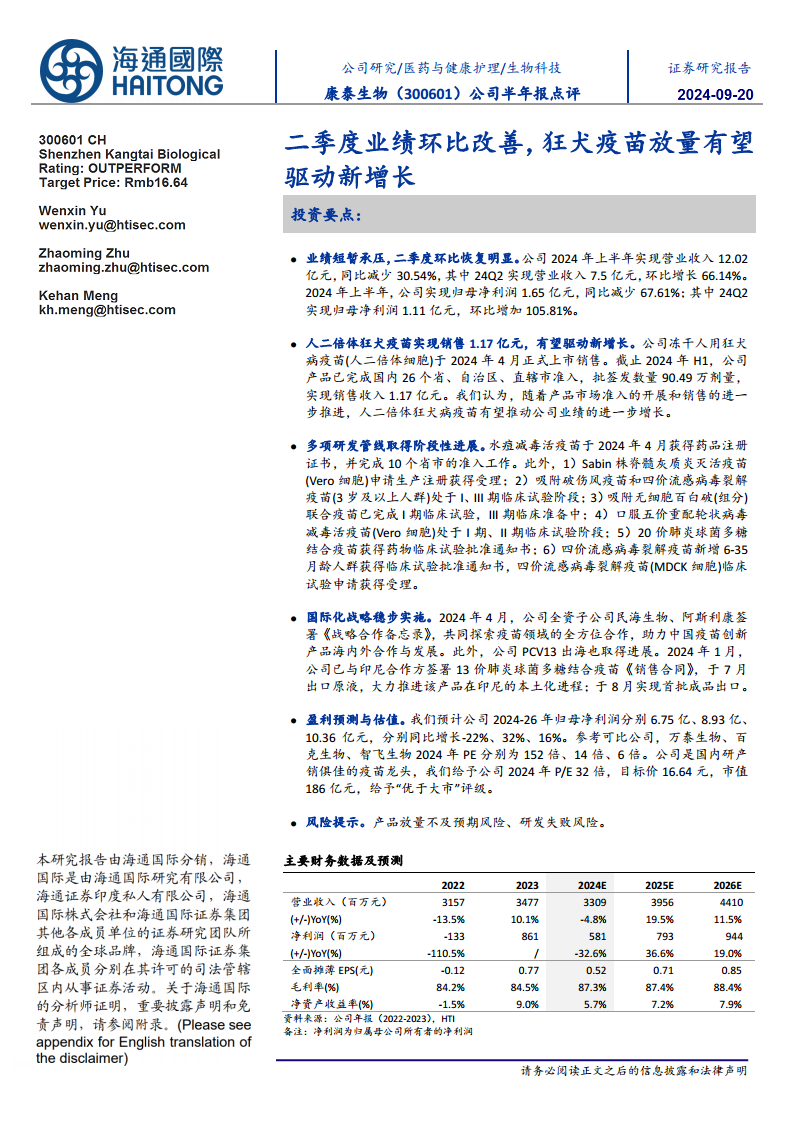 康泰生物(300601)公司半年报点评:二季度业绩环比改善,狂犬疫苗放量有望驱动新增长