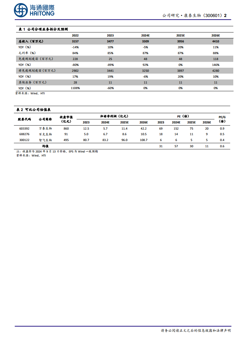基于公司当前的业绩表现、新产品放量预期、丰富的研发管线以及国际化战略的推进,分析师对康泰生物的未来盈利能力持乐观态度。预计公司2024年至2026年的归母净利润将分别达到6.75亿元、8.93亿元和10.36亿元,同比增长率分别为-22%、32%和16%。尽管2024年受上半年业绩影响有所下滑,但2025年和2026年将恢复强劲增长。 在估值方面,参考可比公司万泰生物、百克生物和智飞生物2024年的预测市盈率(PE)分别为152倍、14倍和6倍,康泰生物作为国内研产销俱佳的疫苗龙头企业,被给予2024年32倍的P/E估值。据此,目标价设定为16.64元,对应市值186亿元。综合考虑公司的成长潜力和市场地位,分析师给予康泰生物“优于大市”的投资评级。