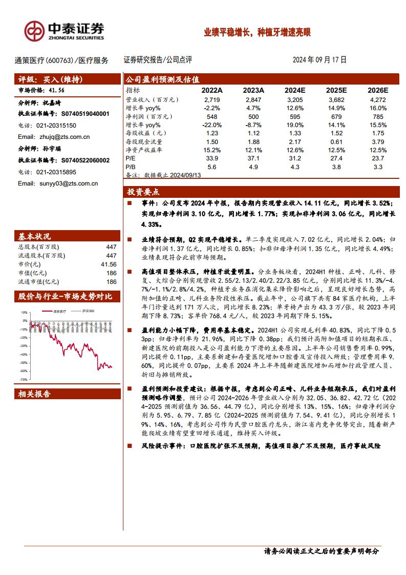 尽管盈利预测有所调整,分析师仍维持对通策医疗的“买入”评级。理由是公司作为民营口腔医疗龙头,在浙江省内竞争优势突出,随着新产能的逐步爬坡,业绩有望重回增长通道。同时,报告提示了潜在风险,包括口腔医院扩张不及预期、高值项目推广不及预期以及医疗事故风险。