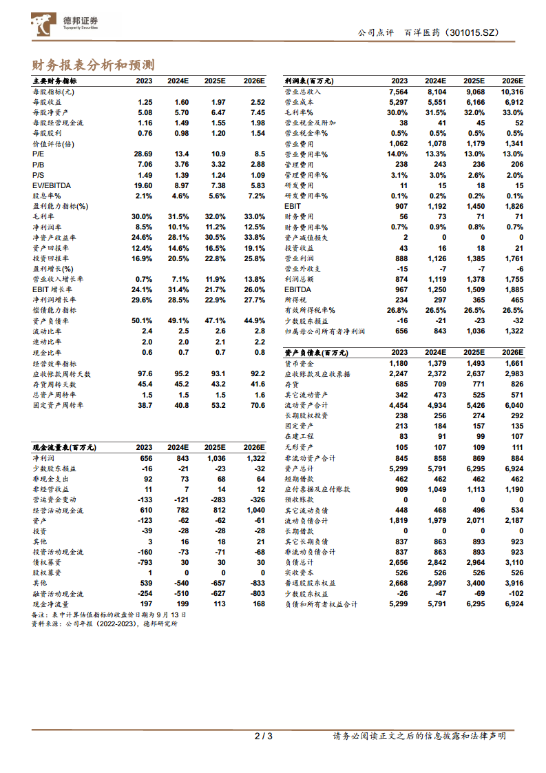 从财务数据分析来看,百洋医药展现出健康的盈利能力、持续优化的运营效率和稳健的偿债能力。公司营业收入和归母净利润预计将保持高速增长,毛利率和净资产收益率持续提升,经营性现金流充裕,这些都表明公司具备强大的内生增长动力和良好的财务韧性。分析师基于对公司未来盈利能力的乐观预期,维持了“买入”评级,并指出其估值具有吸引力。综合来看,百洋医药凭借其清晰的战略方向、优化的业务结构、强劲的盈利能力和健康的财务状况,展现出良好的投资价值和广阔的成长潜力。