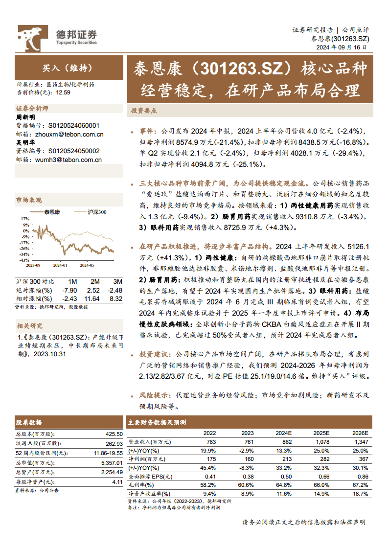 分析师维持对泰恩康的“买入”评级。预测2024-2026年归母净利润分别为2.13亿元、2.82亿元、3.67亿元,对应PE估值分别为25.1倍、19.0倍、14.6倍。