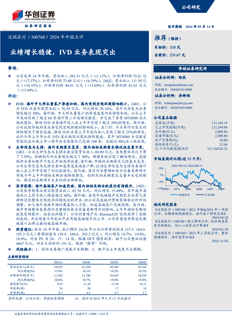 迈瑞医疗(300760)2024年中报点评:业绩增长稳健,IVD业务表现突出