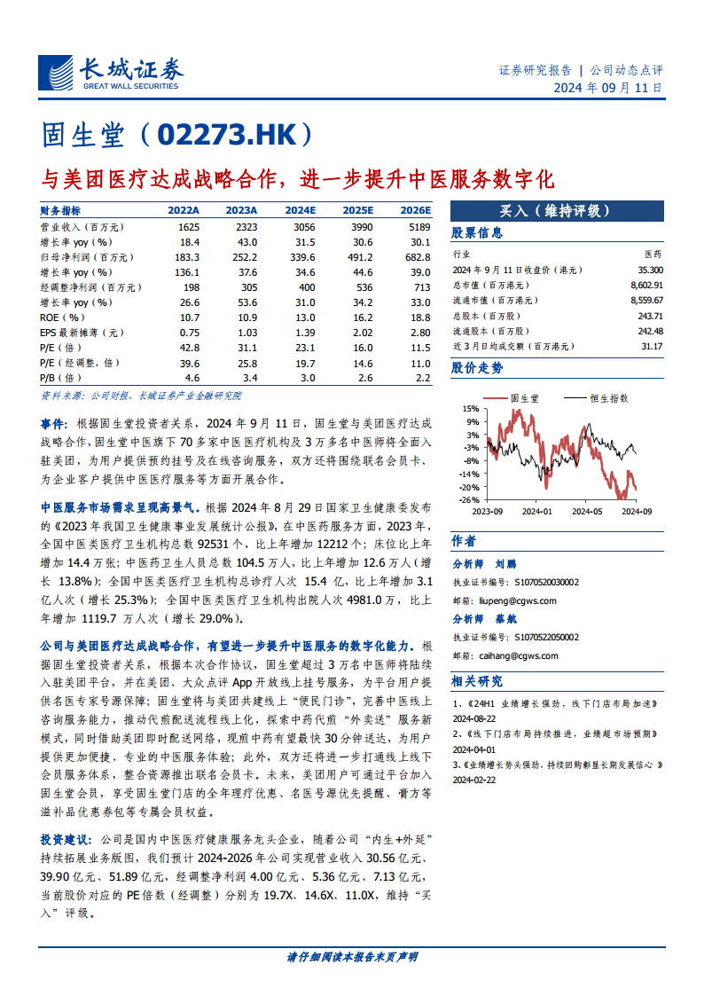 固生堂与美团医疗的战略合作是其在数字化时代背景下,提升中医服务能力和市场竞争力的重要举措。此次合作不仅将固生堂的优质中医资源通过美团平台触达更广泛的用户群体,更通过线上挂号、在线咨询、中药代煎配送等创新服务模式,显著提升了中医服务的便捷性和可及性。结合《2023年我国卫生健康事业发展统计公报》所揭示的中医服务市场高景气度,固生堂有望凭借其“内生+外延”的持续拓展战略,在数字化赋能下进一步巩固其行业龙头地位。报告对公司未来三年的财务表现持乐观态度,预计营业收入和经调整净利润将保持强劲增长,且当前估值具有吸引力。尽管存在核心医师流失、政策变动、并购整合及自建门店等风险,但整体而言,固生堂的长期发展前景依然广阔,因此维持“买入”评级。