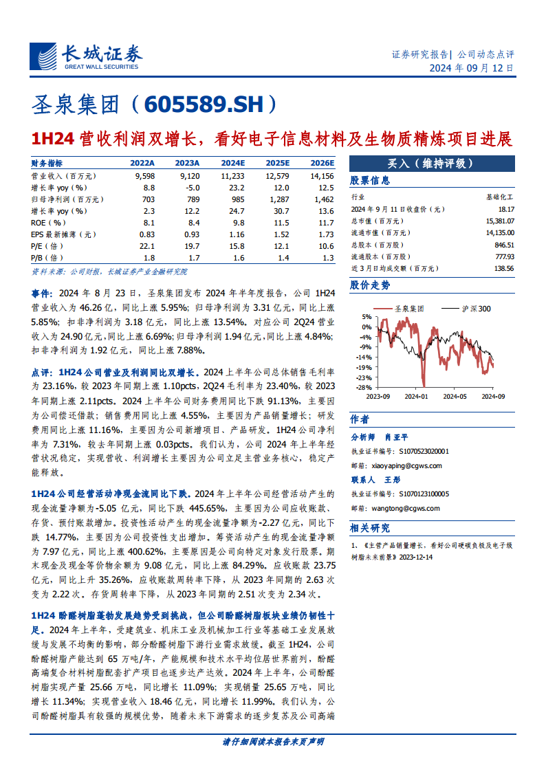 圣泉集团(605589):1H24营收利润双增长,看好电子信息材料及生物质精炼项目进展