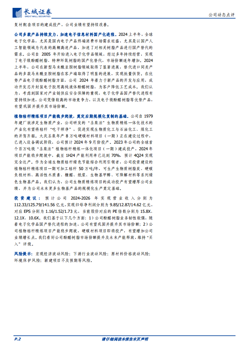 基于以下两方面因素,报告维持对圣泉集团的“买入”评级:1)公司酚醛树脂业务韧性较强,随着电子化学品国产替代进程的加速,公司有望巩固并提升其市场份额;2)公司植物秸秆精炼项目产能稳步爬坡,硬碳材料项目即将投产,有望增加公司业绩增长点。报告看好公司酚醛树脂市场份额提升及未来产能释放。