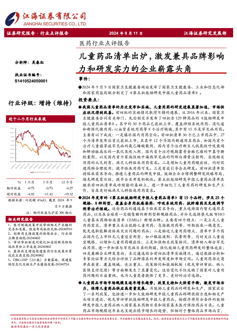 医药行业点评报告:儿童药品清单出炉,激发兼具品牌影响力和研发实力的企业崭露头角