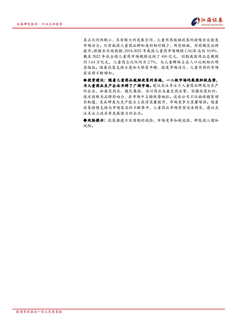 《第五批鼓励研发申报儿童药品清单》的发布,进一步强化了国家对儿童用药研发和生产的政策支持,旨在解决儿科临床用药的突出问题,填补国内用药空白,并提升儿童用药的可及性与顺应性。在政策红利和市场需求的双重驱动下,我国儿童药品市场正迎来快速发展期,尽管当前市场规模占比较小,但增长潜力巨大。建议投资者重点关注在儿童药领域具备研发实力、品牌影响力和市场布局优势的领先企业,以把握行业增长带来的投资机遇,同时警惕政策推进、市场竞争和研发投入等潜在风险。