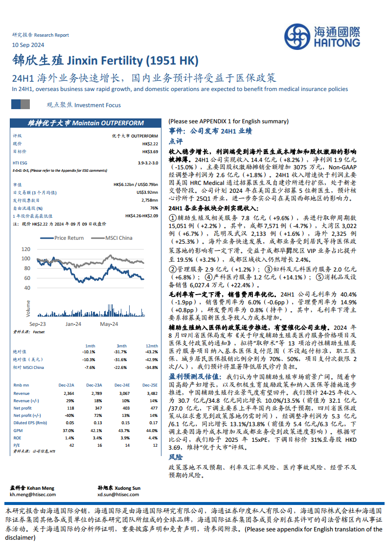 锦欣生殖(01951):24H1海外业务快速增长,国内业务预计将受益于医保政策