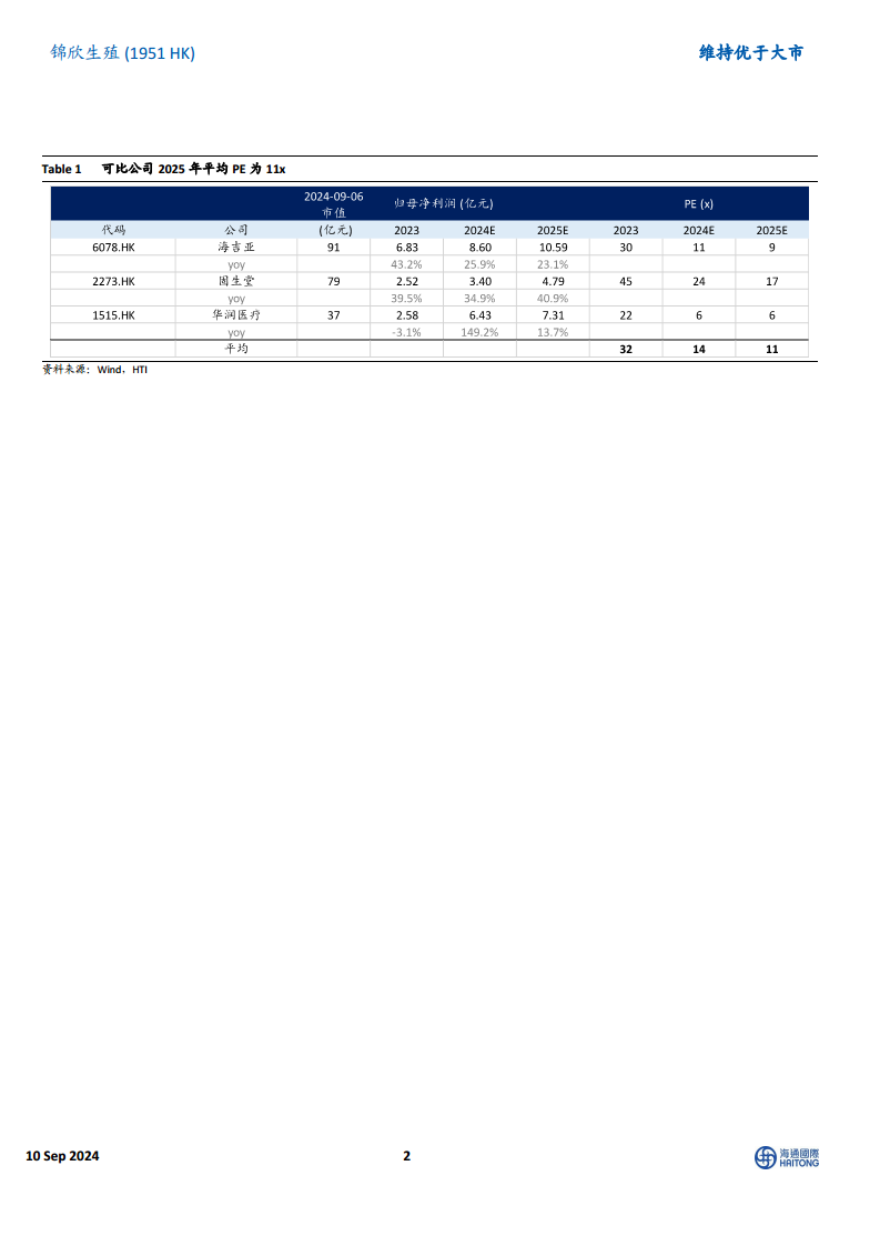 根据可比公司,报告给予锦欣生殖2025年15倍市盈率(PE)的估值。目标价下调31%至每股HKD 3.69,但仍维持“优于大市”的投资评级,表明分析师对公司长期价值的认可。