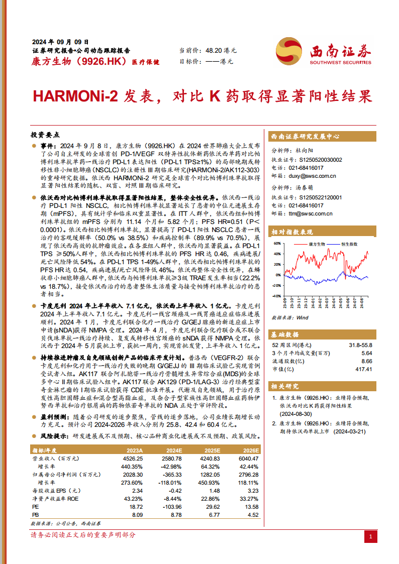 康方生物(09926):HARMONi-2发表,对比K药取得显著阳性结果