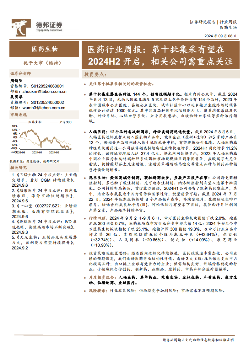 医药行业周报:第十批集采有望在2024H2开启,相关公司需重点关注