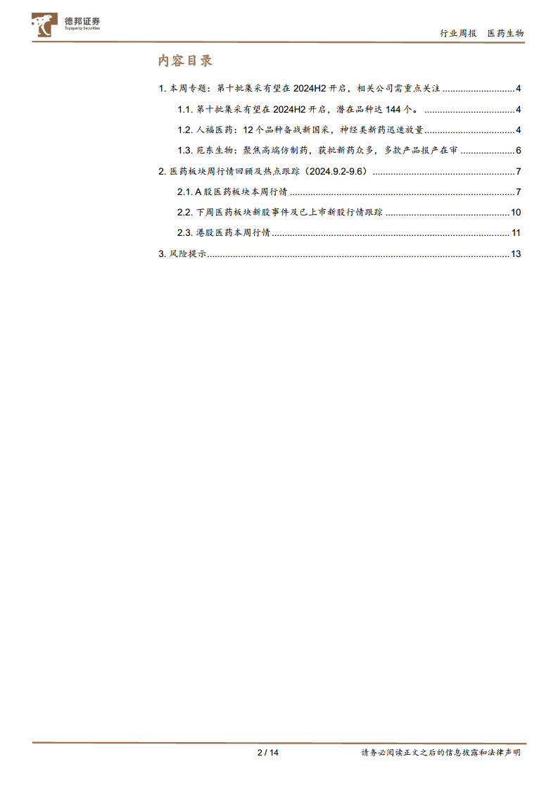 本报告深入分析了医药生物行业在2024年9月2日至9月6日期间的市场表现及未来展望。核心观点聚焦于即将开启的第十批国家药品集中采购,该轮集采预计将覆盖144个品种,涉及超千亿市场规模,其中注射剂占据主导地位。报告通过数据详细阐述了人福医药和苑东生物等重点企业如何积极应对集采,通过丰富产品管线、加速新药放量和持续高研发投入来巩固市场地位并实现业绩增长。同时,报告回顾了A股和港股医药板块的周度及年初至今行情,指出A股医药板块整体承压但部分子板块表现活跃,港股医药板块亦面临挑战。最后,报告提示了行业政策、市场竞争加剧和需求不及预期等潜在风险,强调了在老龄化背景下医药行业结构性投资机会的持续性。