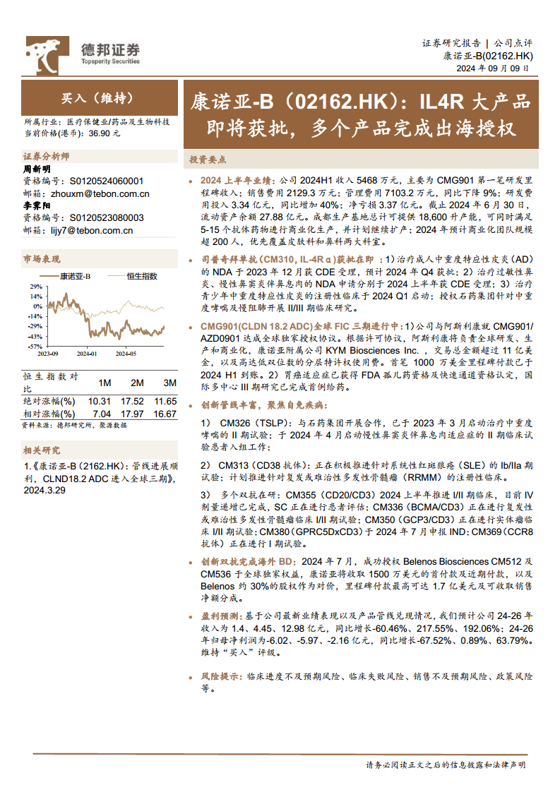 尽管公司在2024年上半年仍处于高研发投入导致的净亏损状态,但CMG901的首笔研发里程碑收入已开始贡献营收。根据盈利预测,康诺亚-B预计在2025年至2026年实现收入的爆发式增长,并逐步收窄净亏损,显示出其未来盈利能力的巨大潜力。公司维持“买入”评级,但投资者仍需关注临床进度、市场销售及政策变化等潜在风险。