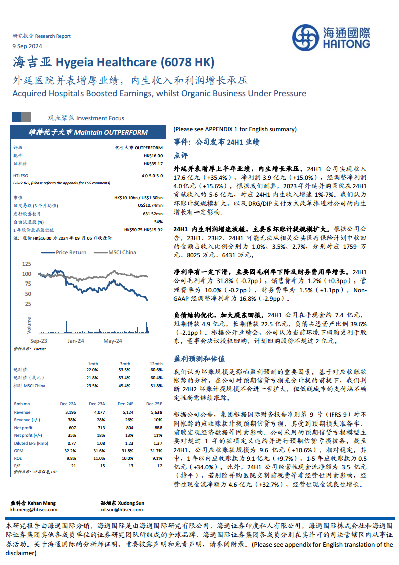 海吉亚医疗(6078 HK)2024年上半年业绩显著增长,主要得益于外延并购医院的并表贡献,使得总收入和净利润实现双位数增长。然而,剔除并购影响后,公司内生业务的收入和利润增长面临较大压力,主要受到坏账计提规模扩大以及DRG/DIP支付方式改革推进等因素的负面影响。