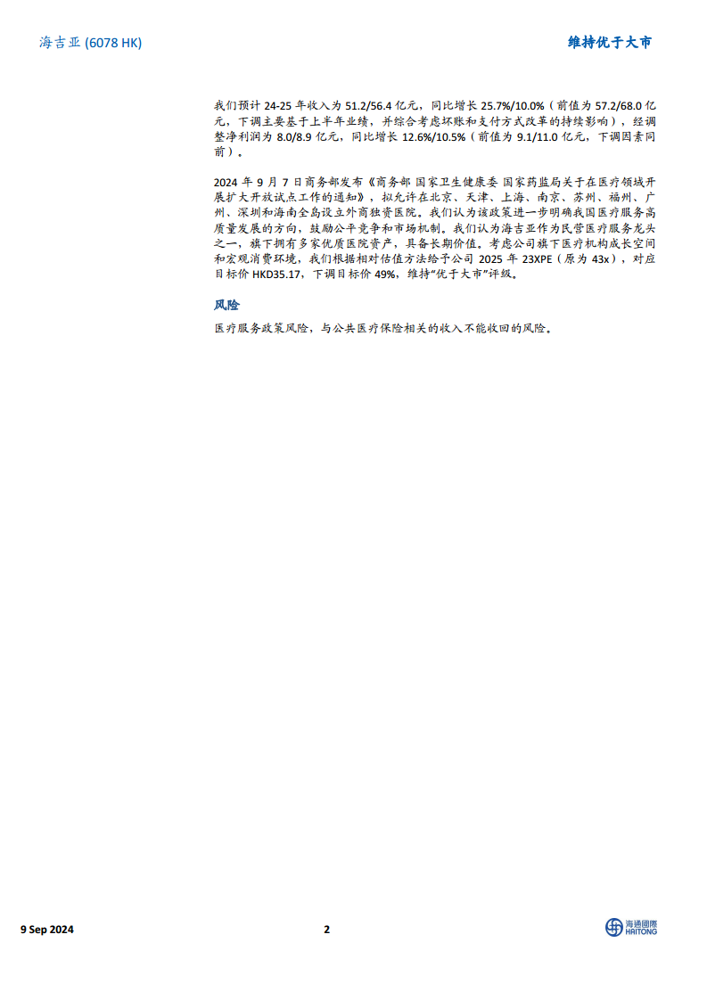 海吉亚医疗2024年上半年业绩表现出外延并购驱动的强劲增长,总收入和净利润均实现显著提升。然而,报告深入分析指出,公司内生业务的增长动力不足,主要受到坏账计提规模扩大和DRG/DIP支付方式改革等因素的制约,导致内生收入和利润增长承压。同时,公司盈利能力有所下滑,净利率因毛利率下降和财务费用率上升而受到影响。尽管公司通过优化负债结构和计划股份回购来提升股东回报,但鉴于内生增长的不确定性和宏观经济环境,分析师下调了未来两年的盈利预测和目标价。尽管如此,考虑到国家医疗服务扩大开放的政策利好以及海吉亚作为民营医疗服务龙头的长期价值,报告仍维持其“优于大市”的评级。投资者需关注医疗服务政策变化及公共医疗保险相关收入回收的风险。