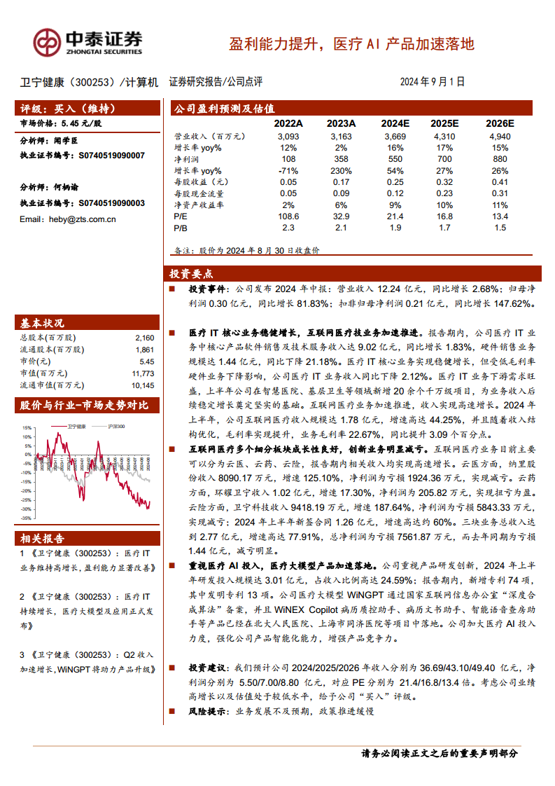 卫宁健康在2024年上半年展现出强劲的盈利能力和稳健的业务发展态势。公司归母净利润和扣非净利润实现大幅增长,主要得益于医疗IT核心业务的稳健发展和互联网医疗业务的高速增长。特别是在互联网医疗领域,多个细分板块表现良好,创新业务减亏明显。此外,公司持续加大对医疗AI的研发投入,并成功推动医疗大模型产品落地应用,进一步增强了市场竞争力。综合来看,卫宁健康通过“IT+互联网医疗+AI”的战略布局,有望在医疗信息化和智能化领域持续保持领先地位,未来业绩增长可期。