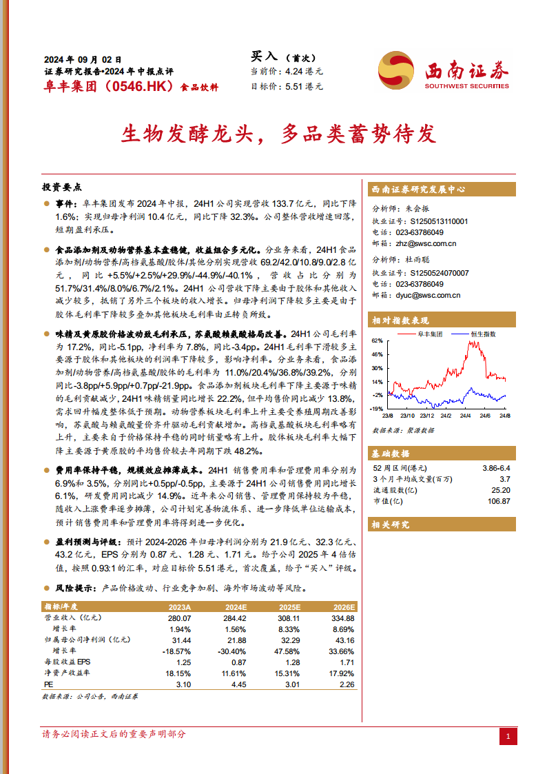 尽管短期业绩波动,公司食品添加剂和动物营养基本盘保持稳健增长,高档氨基酸业务表现亮眼。公司作为全球生物发酵龙头,通过多品类布局和全球化产能扩张策略,持续优化成本结构并提升市场份额。分析师预计2024-2026年归母净利润将实现显著增长,并首次给予“买入”评级,目标价5.51港元,凸显其长期投资价值。