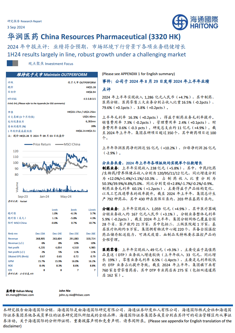 华润医药(03320)2024年中报点评:业绩符合预期,市场环境下行背景下各项业务稳健增长