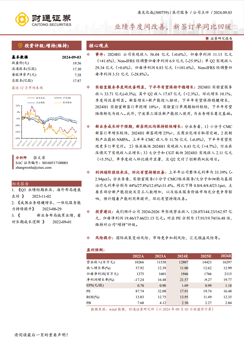 2024年上半年,公司整体毛利率为33.39%,同比下降2.94个百分点。 分业务看,实验室服务、小分子CMC、临床服务、大分子和细胞与基因治疗的毛利率分别为44%、27.8%、12.6%和-31.4%,同比分别下降0.8、4.4、4.4和23.1个百分点。毛利率承压主要系部分新产能投放、员工人数增加以及临床服务市场竞争加剧等因素影响。预计随着产能利用率的提升,毛利率有望持续改善。 基于对公司业务发展的判断,分析师预计公司2024-2026年将实现营业收入128.07亿元、144.23亿元和162.97亿元,归母净利润分别为19.46亿元、17.66亿元和21.15亿元。对应的PE分别为17.91倍、19.74倍和16.48倍。分析师维持对公司“增持”评级。
