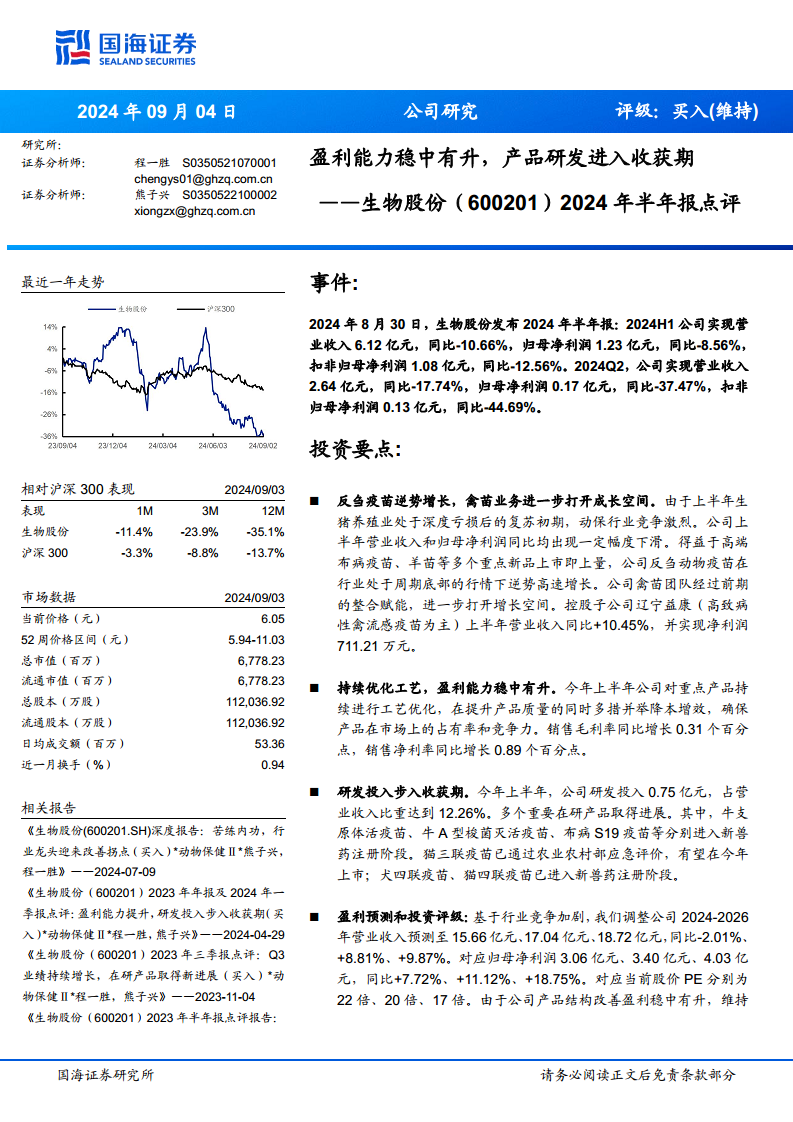 生物股份(600201):2024年半年报点评:盈利能力稳中有升,产品研发进入收获期