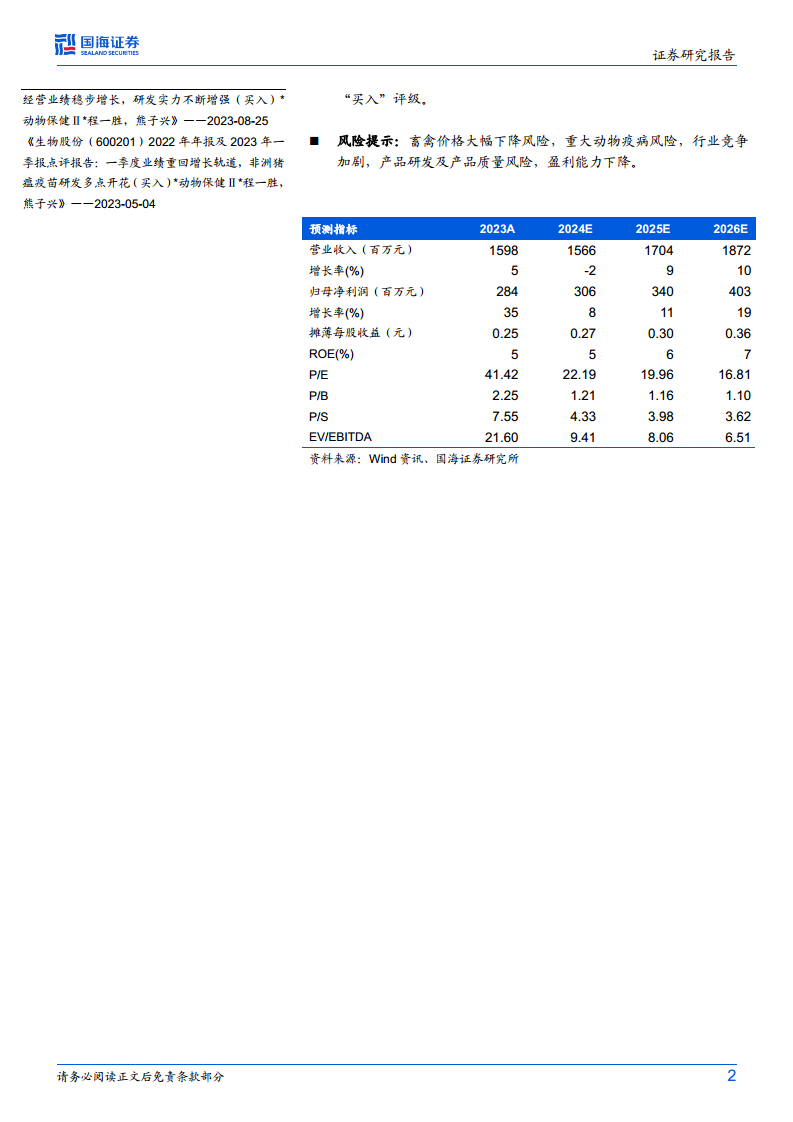 基于行业竞争加剧的考量,国海证券调整了生物股份2024-2026年的营业收入预测,分别为15.66亿元、17.04亿元、18.72亿元,同比增速分别为-2.01%、+8.81%、+9.87%。对应归母净利润预测为3.06亿元、3.40亿元、4.03亿元,同比增速分别为+7.72%、+11.12%、+18.75%。对应当前股价,2024-2026年PE分别为22倍、20倍、17倍。鉴于公司产品结构改善和盈利能力稳中有升,国海证券维持“买入”评级。