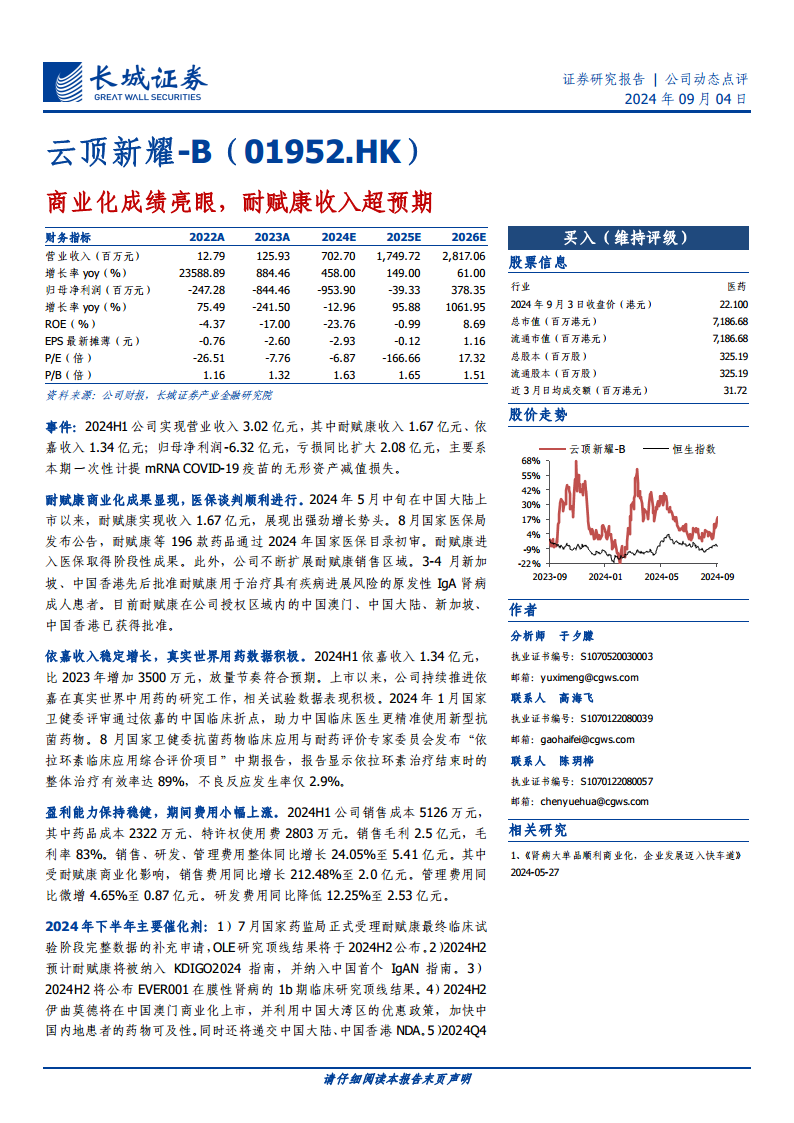 云顶新耀-B在2024年上半年凭借核心产品耐赋康和依嘉的强劲商业化表现,实现了营业收入的显著增长。尽管受一次性资产减值影响,上半年归母净利润亏损扩大,但耐赋康顺利进入医保初审,以及多项产品在研管线的积极进展,预示着公司未来业绩的巨大潜力。财务数据显示,公司营业收入将持续高速增长,盈利能力有望在2026年实现转正。长城证券维持“买入”评级,肯定了公司在产品商业化、研发创新和市场拓展方面的积极成果,并对其长期发展前景持乐观态度,但投资者仍需关注临床试验、市场竞争和医保谈判等潜在风险。