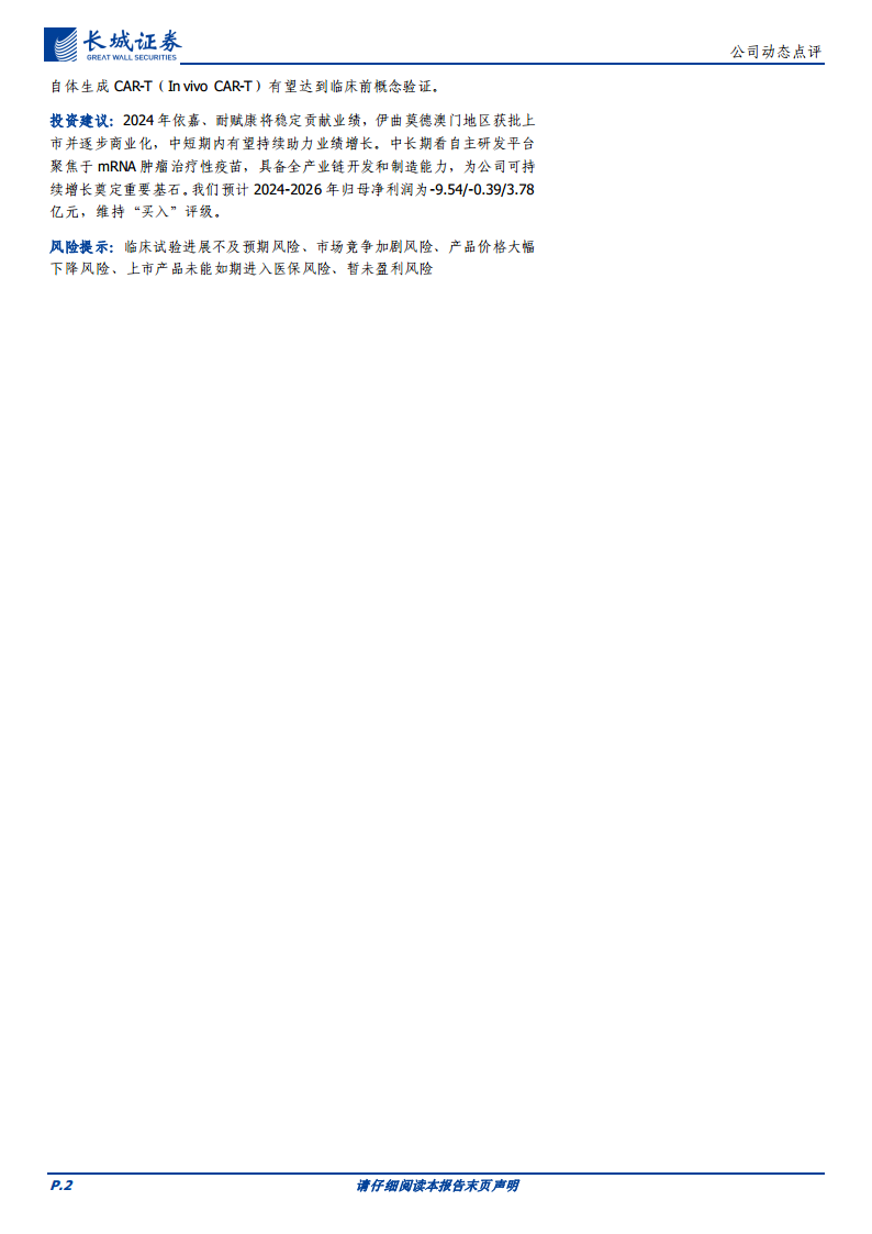 投资建议方面,公司预计2024-2026年归母净利润分别为-9.54/-0.39/3.78亿元,维持“买入”评级。短期内,依嘉、耐赋康将稳定贡献业绩,伊曲莫德在澳门的商业化也将助力业绩增长。长期来看,公司自主研发的mRNA肿瘤治疗性疫苗平台具备全产业链开发和制造能力,为可持续增长奠定基石。 风险提示包括临床试验进展不及预期、市场竞争加剧、产品价格大幅下降、上市产品未能如期进入医保以及暂未盈利风险。
