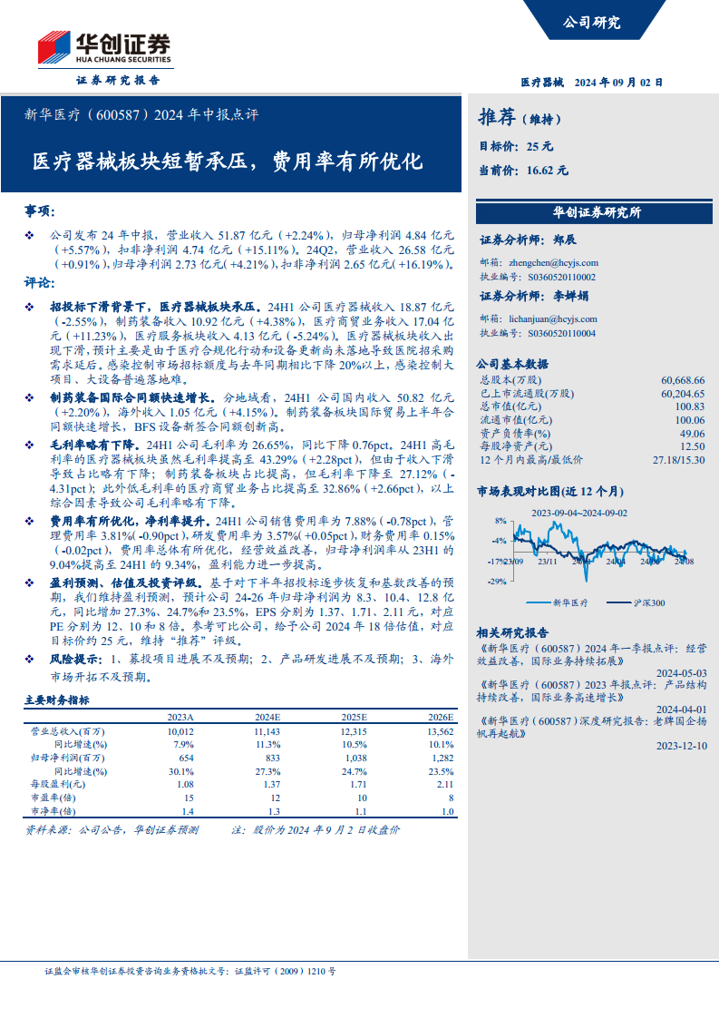 新华医疗(600587):2024年中报点评:医疗器械板块短暂承压,费用率有所优化