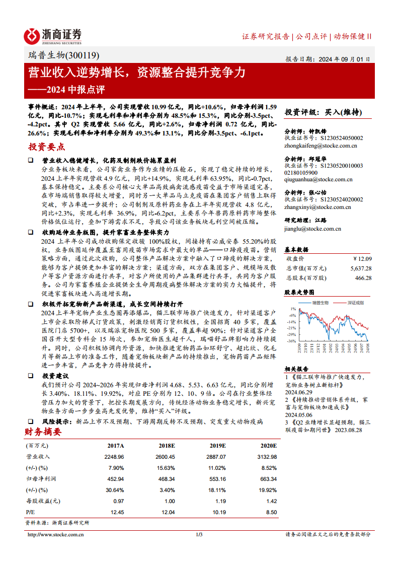 瑞普生物在2024年上半年实现了营业收入的逆势增长,但受兽药原料药价格低位运行影响,盈利能力有所承压。公司通过巩固家禽业务的稳定增长,并战略性收购保定收骏以拓展家畜口蹄疫疫苗市场,显著提升了其在经济动物疫病整体解决方案领域的竞争力。同时,公司在宠物业务领域积极创新,猫三联疫苗市场推广成效显著,并储备多款新品,为未来发展注入强劲动力。分析师基于公司稳健的传统业务和快速发展的创新业务,维持“买入”评级,展望公司未来盈利能力的持续提升,但需关注新品上市、下游周期及动物疫病等潜在风险。
