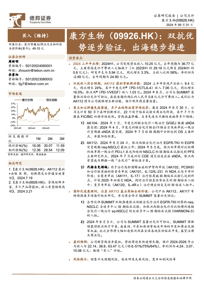基于新管线的逐步获批和商业化,德邦研究所预计康方生物2024-2026年收入将分别达到22.14亿元、38.8亿元和63.47亿元,增速分别为-51%、75%和64%。净利润预计分别为-4.24亿元、3.07亿元和15.08亿元。维持“买入”评级。主要风险包括销售不及预期、临床研发失败以及市场竞争加剧等。