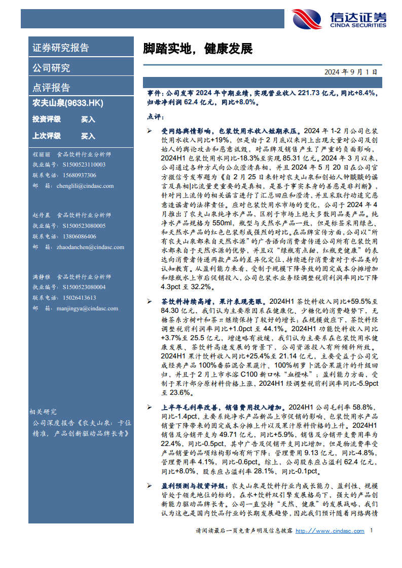 本报告核心观点指出,尽管农夫山泉在2024年上半年受到网络舆情影响,导致包装饮用水业务短期承压,但公司凭借其强大的品牌韧性、积极的市场应对策略以及茶饮料和果汁业务的强劲增长,展现出稳健的业绩表现。公司坚持“天然、健康”的发展战略,通过产品创新和品类多元化,有效对冲了单一业务的风险,并维持了领先的行业地位。