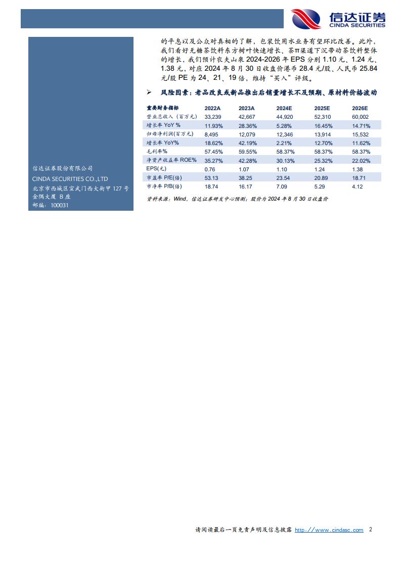 分析师预计,随着网络舆情的平息和公众对真相的了解,包装饮用水业务有望实现环比改善。同时,无糖茶饮料“东方树叶”的快速增长和“茶π”的渠道下沉将带动茶饮料整体增长。 信达证券预测农夫山泉2024-2026年每股收益(EPS)分别为1.10元、1.24元、1.38元。基于2024年8月30日收盘价,对应市盈率(PE)分别为24倍、21倍、19倍。