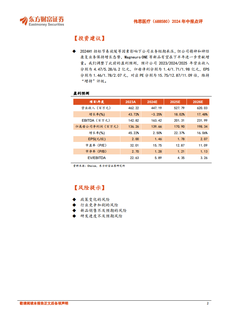 鉴于公司短期业务承压,但精神和神经康复业务保持增长,且Magneuro ONE等新品有望在下半年贡献增量,东方财富证券研究所调整了盈利预测。预计公司2024/2025/2026年营业收入分别为4.47/5.28/6.2亿元,归母净利润分别为1.40/1.71/1.98亿元,维持“增持”评级。同时,报告提示了政策变化、行业竞争加剧、新品销售不及预期以及研发进度不及预期等潜在风险,投资者需予以关注。