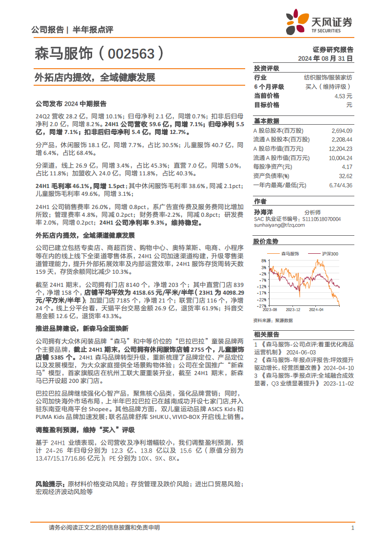 森马服饰在2024年上半年展现出稳健的经营态势,营收和归母净利润均实现增长,其中儿童服饰业务贡献突出。公司通过“外拓店内提效”策略,优化了全渠道零售体系,提升了运营效率,存货周转和门店平效均有所改善。在品牌建设方面,“新森马”模型的推广和巴拉巴拉品牌的国际化拓展,标志着公司在市场扩张和品牌升级方面的积极进展。尽管分析师基于上半年业绩对未来盈利预测进行了小幅调整,但考虑到公司在多品牌、全渠道和精细化运营方面的战略投入,其长期健康发展潜力依然存在,因此维持“买入”评级。
