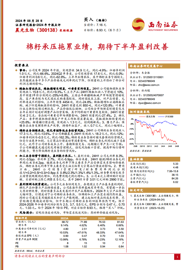 晨光生物(300138):棉籽承压拖累业绩,期待下半年盈利改善