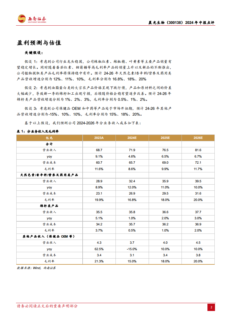 分析师选取海天味业、金龙鱼、双汇发展作为可比公司,其2024年平均预测市盈率(PE)为29倍。晨光生物作为植提物行业龙头,具备稳健增长的主力产品、快速成长的梯队产品,以及规模化带来的成本优势,铸就了宽广的护城河。尽管短期受大宗产品价格波动影响,棉籽业务承压,但中长期回报率依然可观。预计2024-2026年归母净利润分别为2.5亿元、3.7亿元、5.5亿元,对应EPS分别为0.47元、0.70元、1.03元。给予公司2024年19倍PE,对应目标价8.93元,维持“买入”评级。主要风险包括宏观经济波动、市场需求低迷以及原材料价格波动。