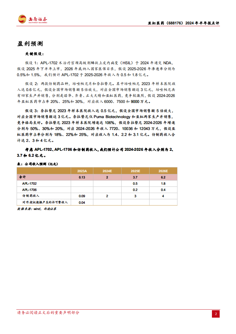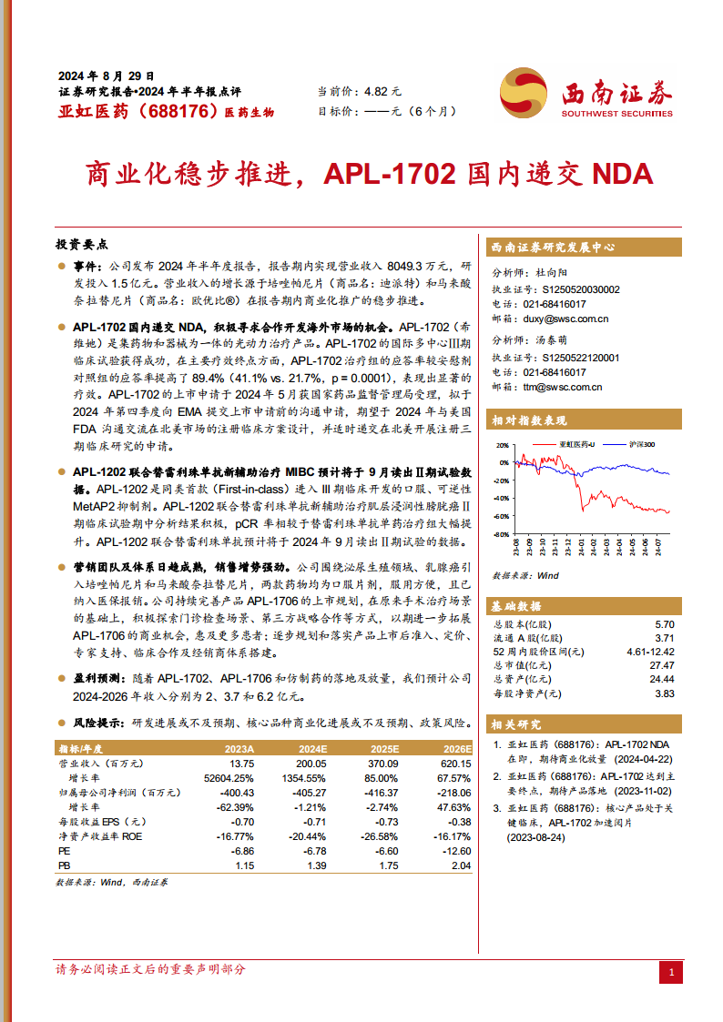 亚虹医药在2024年上半年通过创新药研发的积极推进和仿制药商业化的稳健增长,实现了营收的显著提升。核心产品APL-1702在国内递交NDA并积极布局海外市场,APL-1202的临床试验也取得良好进展,预示着公司未来产品管线的丰富和市场潜力的释放。同时,培唑帕尼片和马来酸奈拉替尼片等仿制药凭借成熟的营销体系和医保覆盖,持续贡献营收。尽管公司短期内仍将面临研发投入带来的亏损,但随着创新药的逐步上市和仿制药市场份额的扩大,预计未来几年收入将实现快速增长,盈利能力有望逐步改善。投资者需关注研发和商业化进展以及政策变化可能带来的风险。