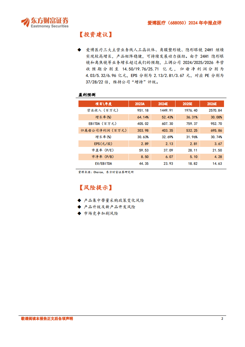 爱博医疗三大主营业务线(人工晶状体、角膜塑形镜、隐形眼镜)在2024年上半年继续实现较高增长,产品矩阵稳健,可持续发展动力强劲。鉴于隐形眼镜和离焦镜等业务增长超出预期,分析师上调了公司2024/2025/2026年的营收预测分别至14.50/19.76/25.71亿元,归母净利润预测分别至4.03/5.32/6.96亿元。对应的EPS分别为2.13/2.81/3.67元,对应PE分别为37/28/22倍。基于此,维持公司“增持”评级。