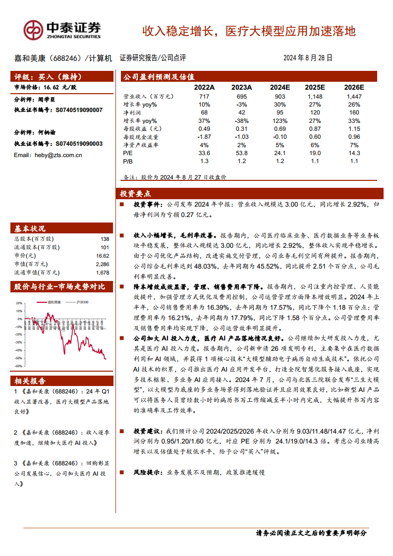 嘉和美康在2024年上半年展现出稳健的收入增长和显著的运营效率提升,尤其在毛利率改善和费用控制方面表现突出。公司在医疗AI领域的战略性投入已开始显现成效,通过核心技术突破和“三生大模型”等创新产品的落地,大幅提升了医疗服务效率和质量,为其未来发展奠定了坚实基础。结合其高增长预期和当前估值,公司具备较强的投资吸引力。