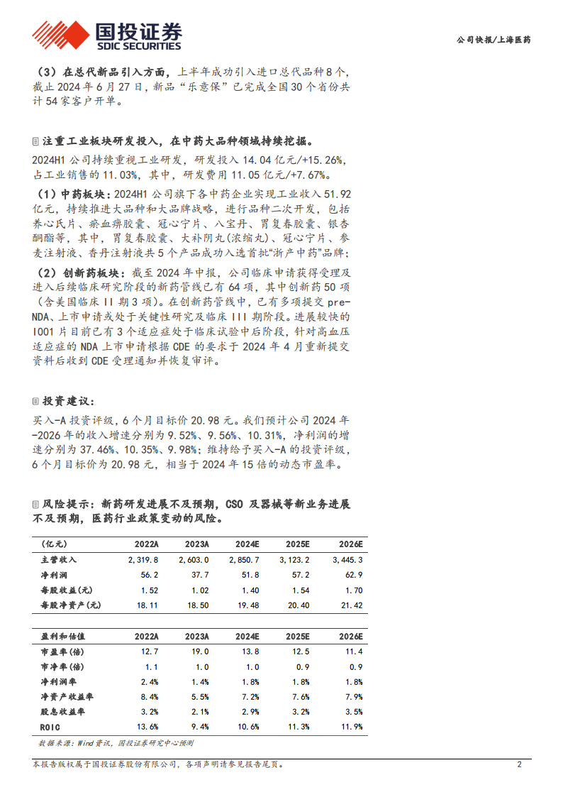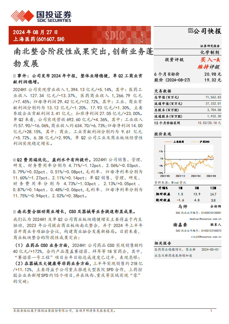 上海医药2024年上半年通过“南北整合”战略显著推动了商业板块的创新发展,CSO和非药业务表现亮眼。同时,公司在工业板块持续加大研发投入,在中药大品种二次开发和创新药管线推进方面取得了积极进展。尽管工业收入短期承压,但整体盈利能力在费用优化下有所提升,归母净利润实现稳健增长。展望未来,公司在商业模式创新和工业研发驱动下,有望实现持续增长,维持“买入-A”评级。