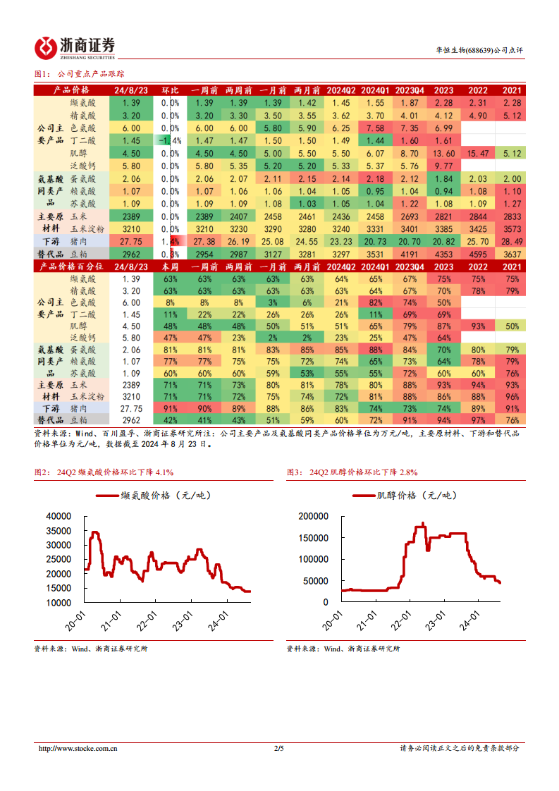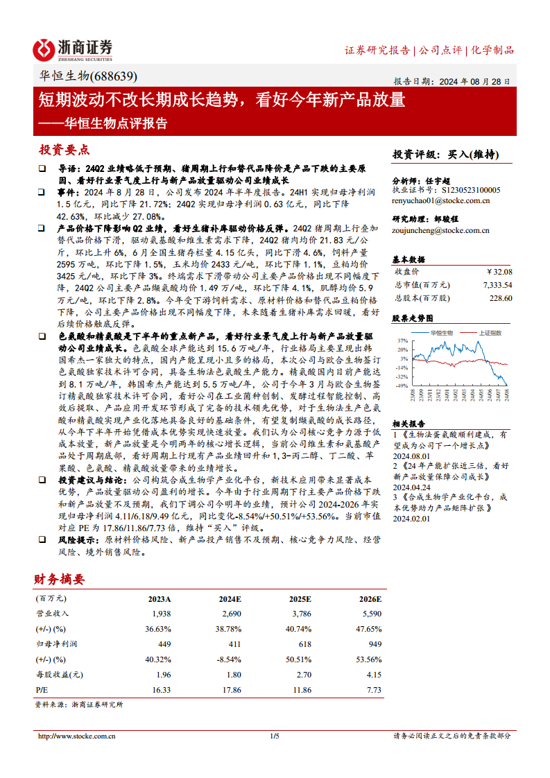 华恒生物2024年第二季度业绩表现略低于市场预期,主要受猪周期上行导致下游需求疲软以及替代品价格下降等多重因素影响,导致公司主要产品价格出现不同程度下滑。然而,报告强调这仅是短期波动,公司长期成长趋势不变。展望未来,随着生猪补库需求回暖,现有产品价格有望触底反弹;同时,公司在合成生物学领域的持续投入和新产品(如色氨酸、精氨酸)的成功放量,将成为驱动业绩增长的核心动力。