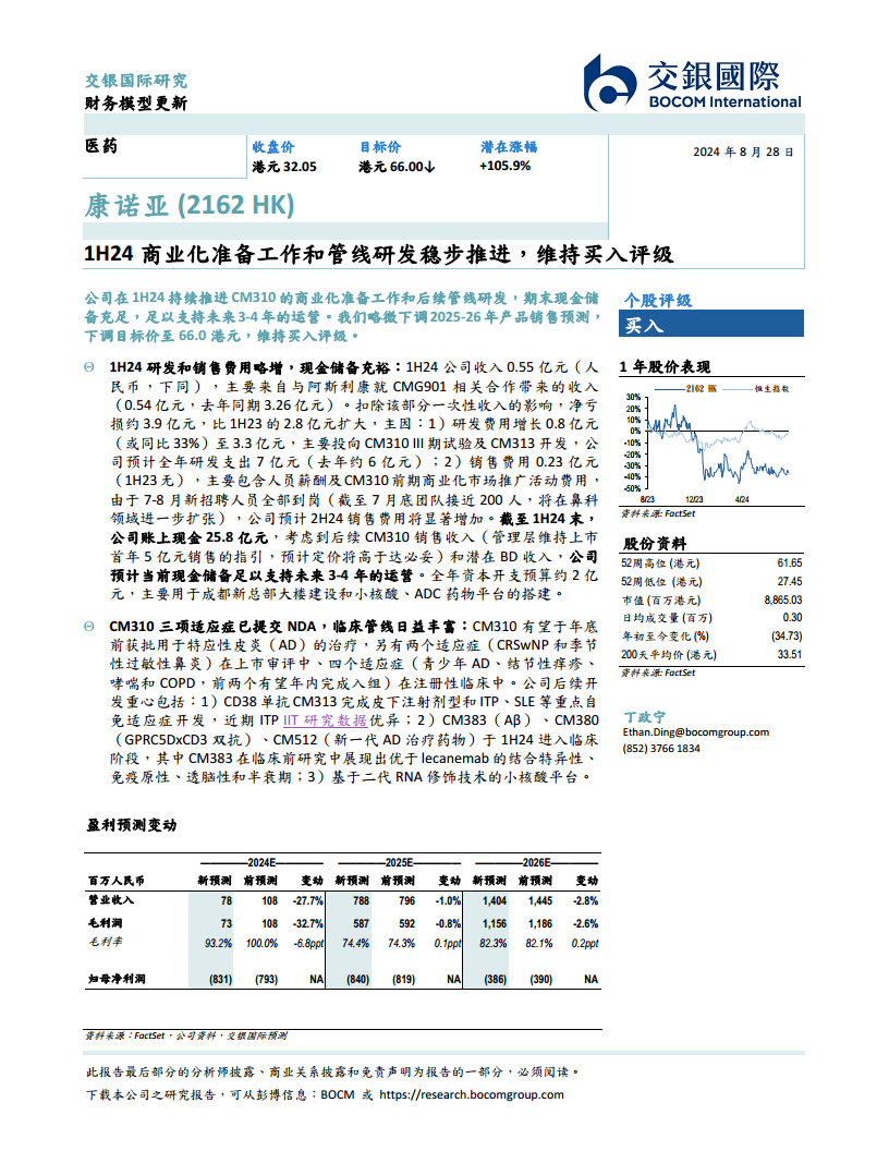 交银国际基于最新的市场动态和公司进展,对康诺亚2025-2026年的产品销售预测进行了小幅调整。具体而言,2025年营业收入预测从7.96亿元人民币下调至7.88亿元,降幅为1.0%;2026年营业收入预测从14.45亿元下调至14.04亿元,降幅为2.8%。相应的,毛利润预测也略有下调,例如2024年毛利率预测从100.0%下调